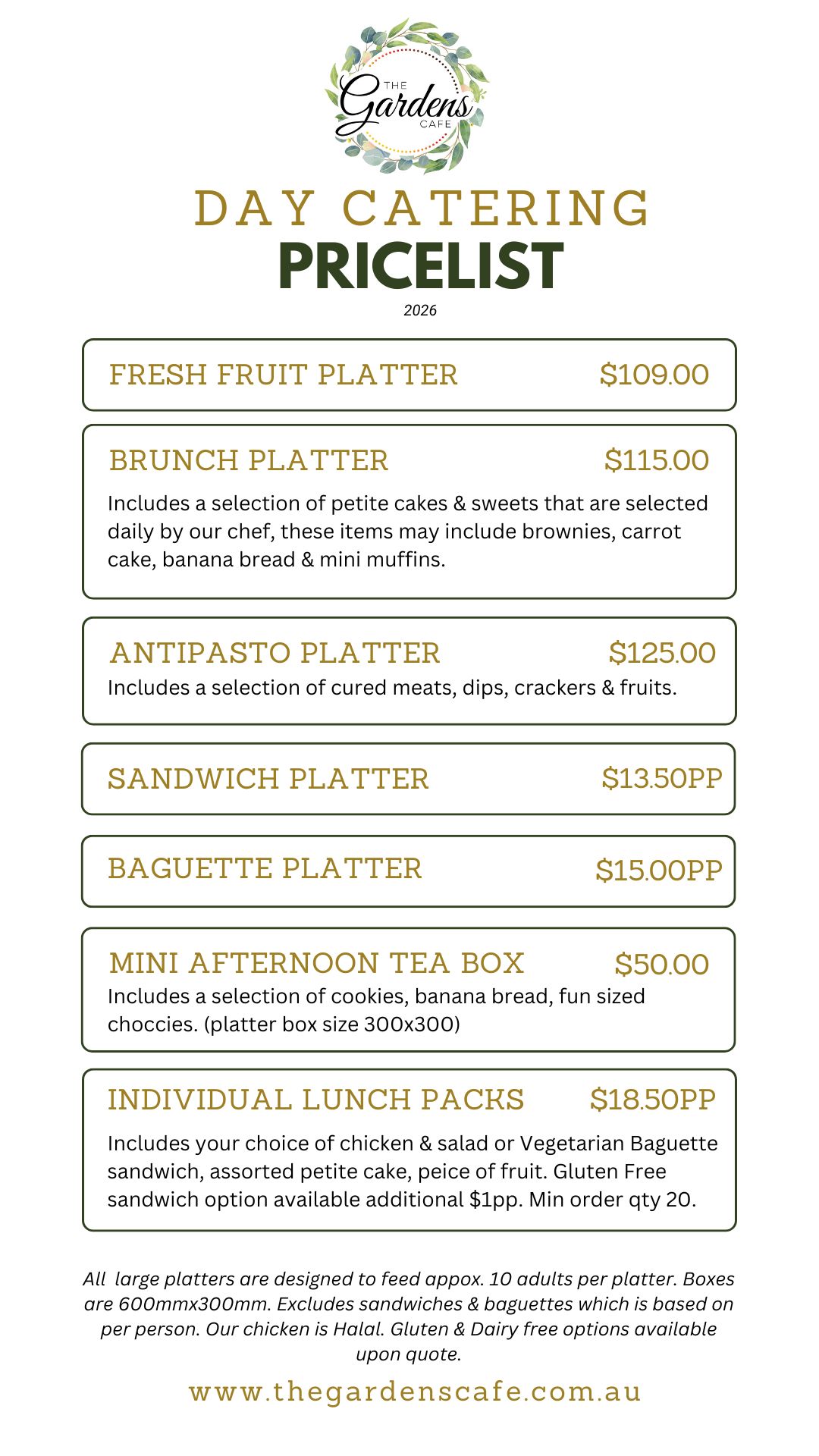 The Gardens Cafe offers catering boxes for your guests to enjoy during their morning tea break or lunch.
